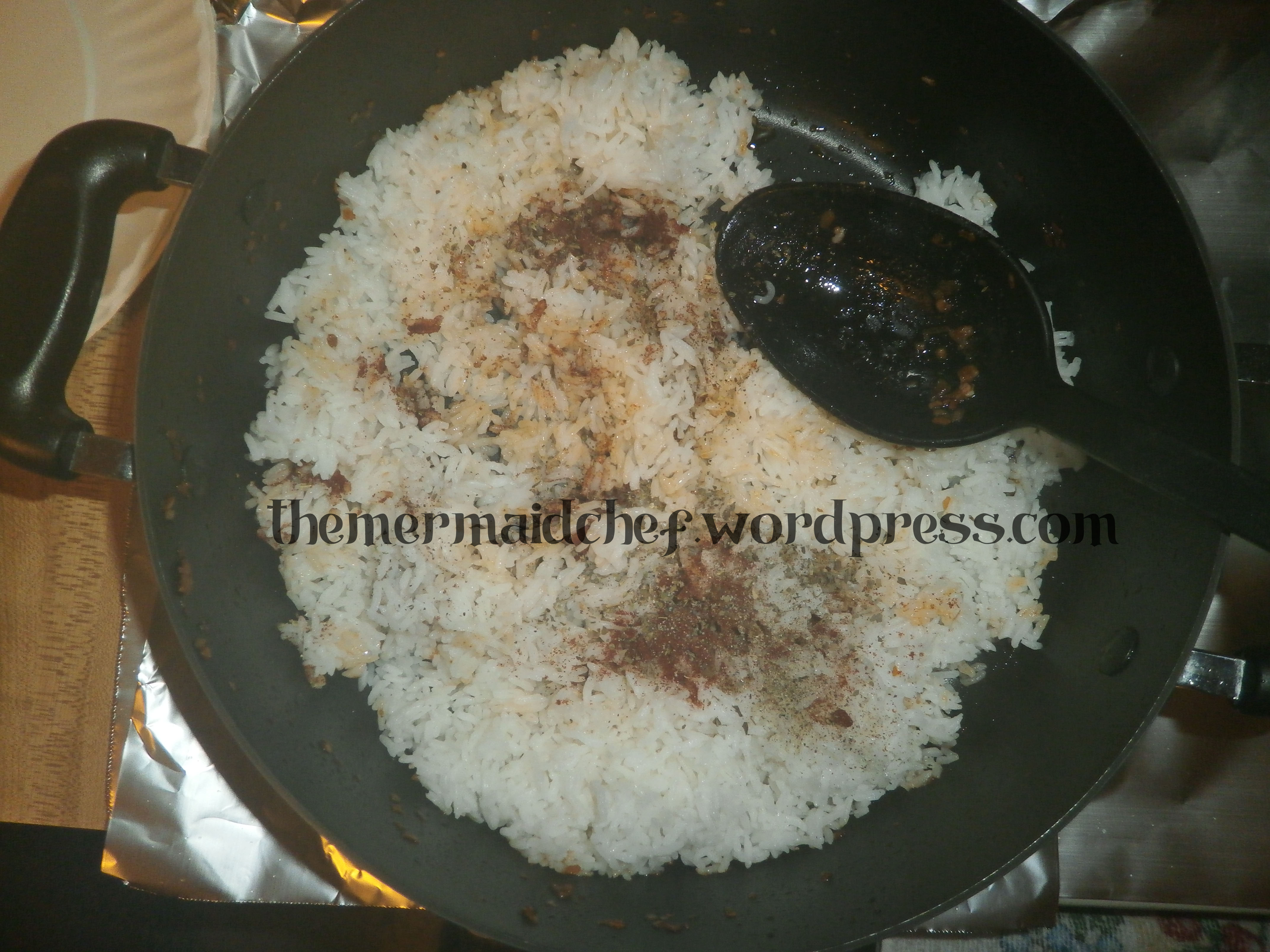 2. Once your rice is done, start placing rice into a pan that has dried minced garlic and oil. Add your seasonings (all of the above).