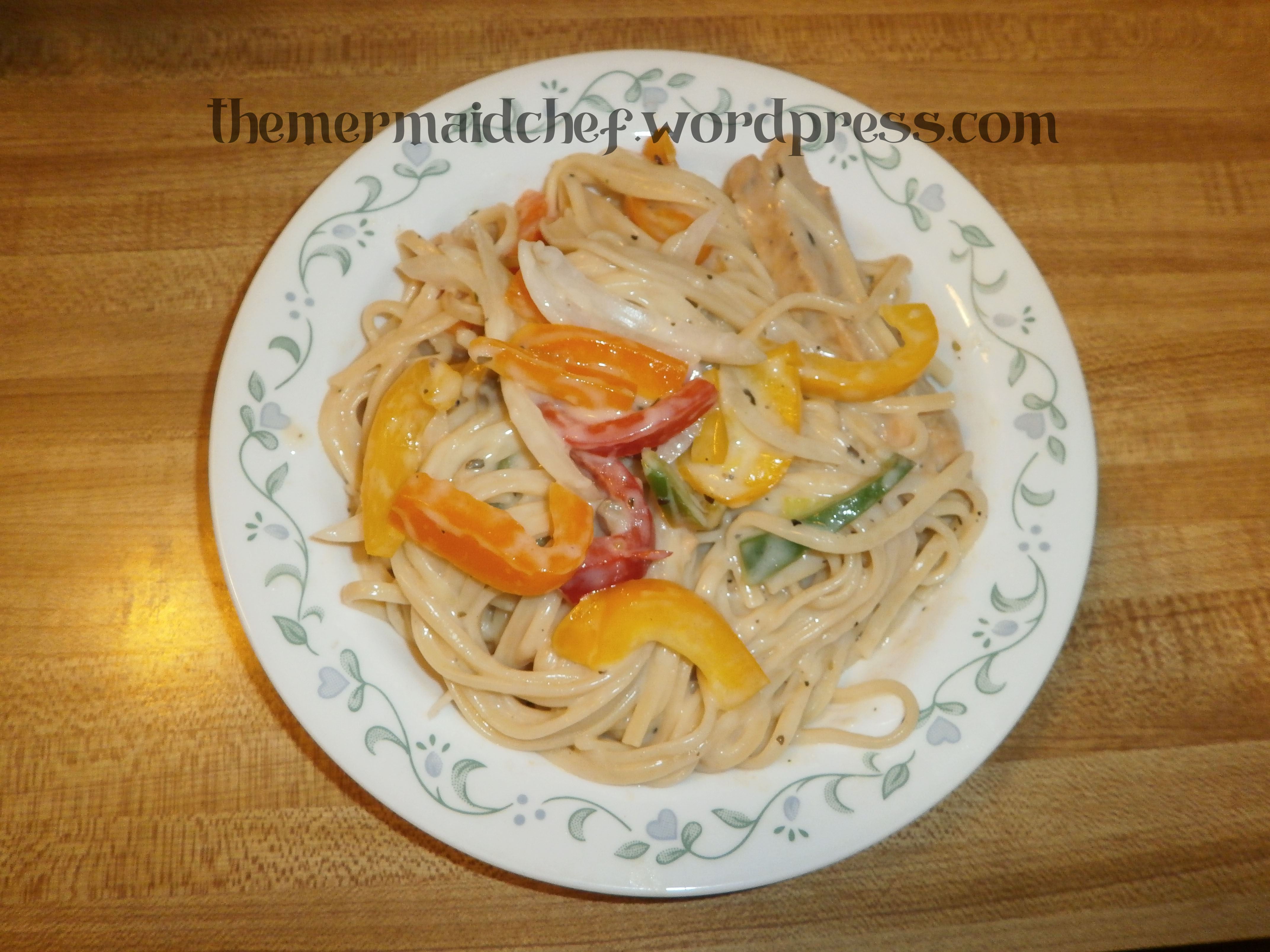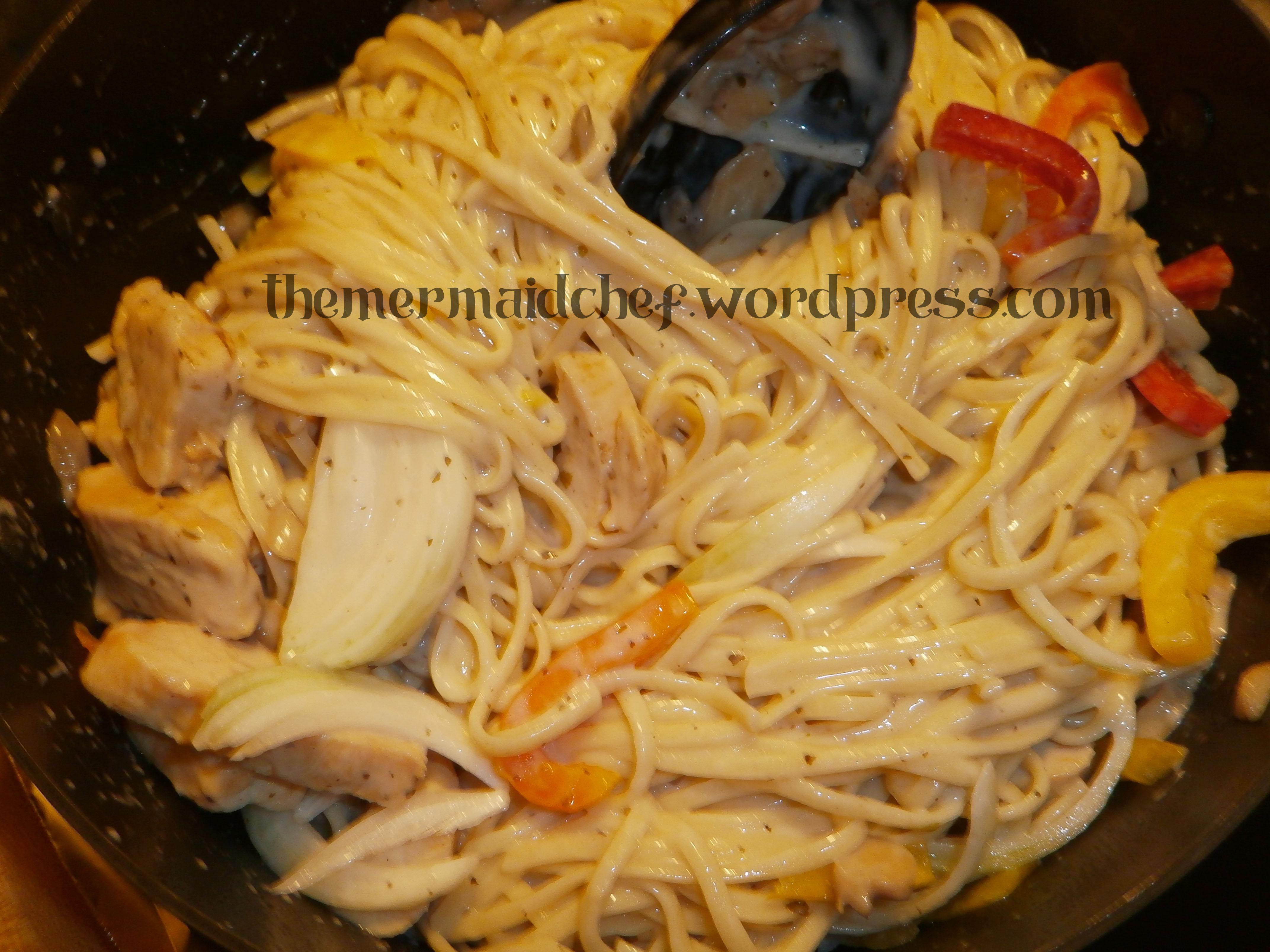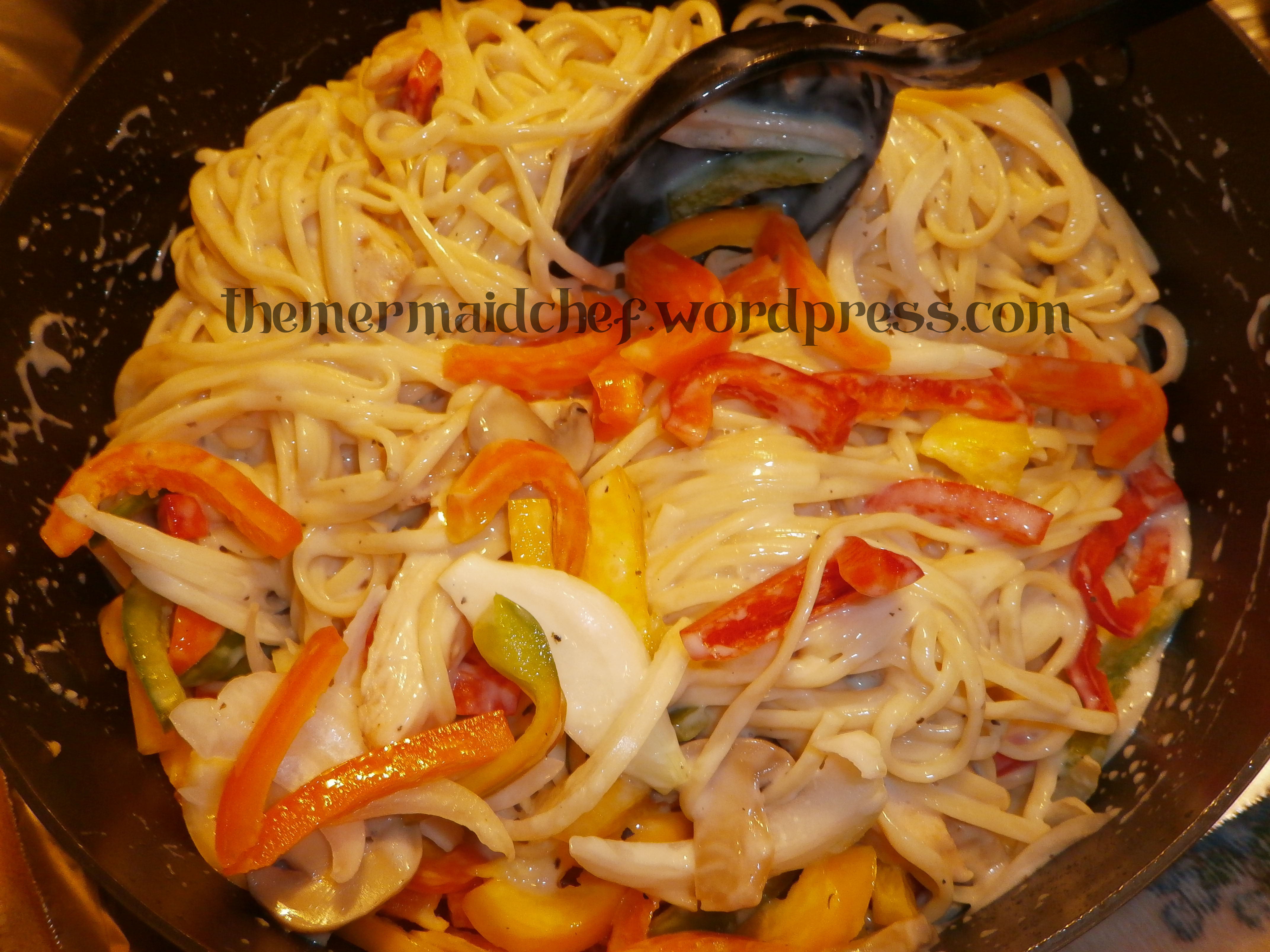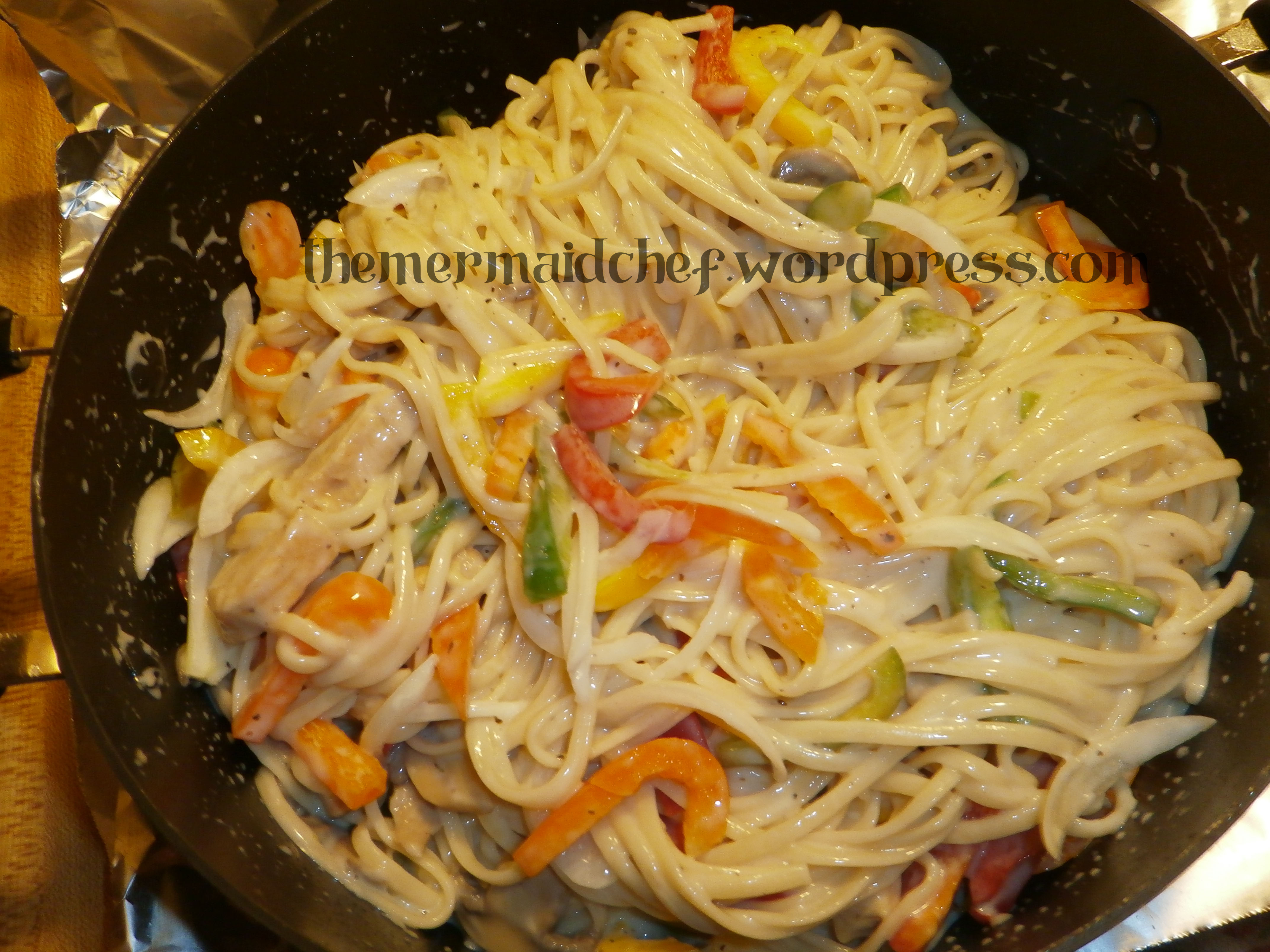 5. Mix your sauce, peppers and onions after your alfredo has heated up with your noodles.