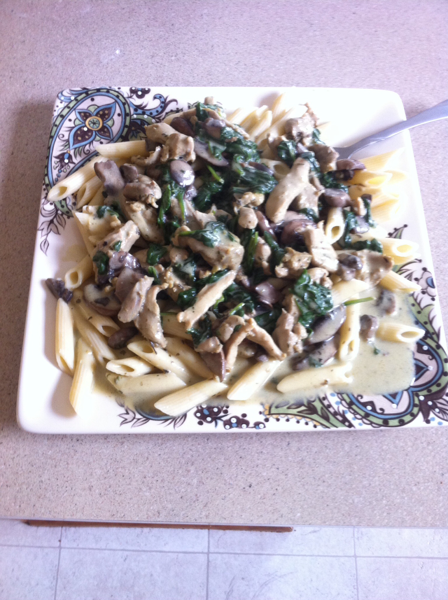 A little watery than I would have preferred but that is because of the oil I had put in, too much! Other than that, penne pasta, chicken, mushrooms, and spinach. This was so good that I was able to eat it the next day! Also, I think that spinach is my favorite thing to put in alfredo because it adds a great texture that is, surprisingly, better than green peppers.
