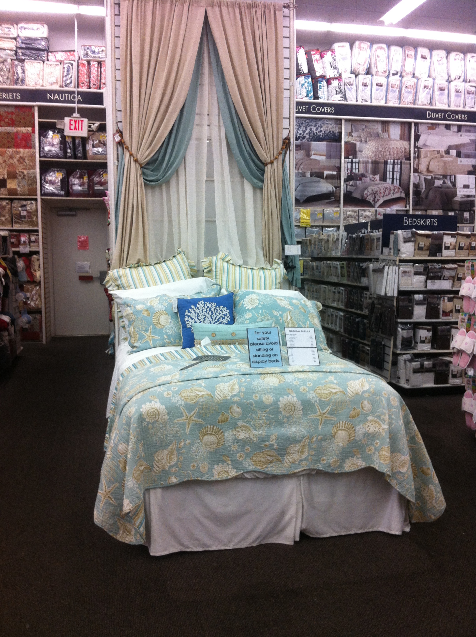 Does it make me strange for loving bedding displays? I think that bedding is something that a person can change and make the dynamic of their living space change. I like the two curtains combined because any sandy color makes me think of the beach and most blues do too. I think that the combination above is really great to create a warm environment, is that weird to say? Well, the the great thing about the comforter and pillows is that they are the accent. The bed sheets and skirt are white so if you decided to get this you can always change the comforter, hence making it easier to change colors if you want.