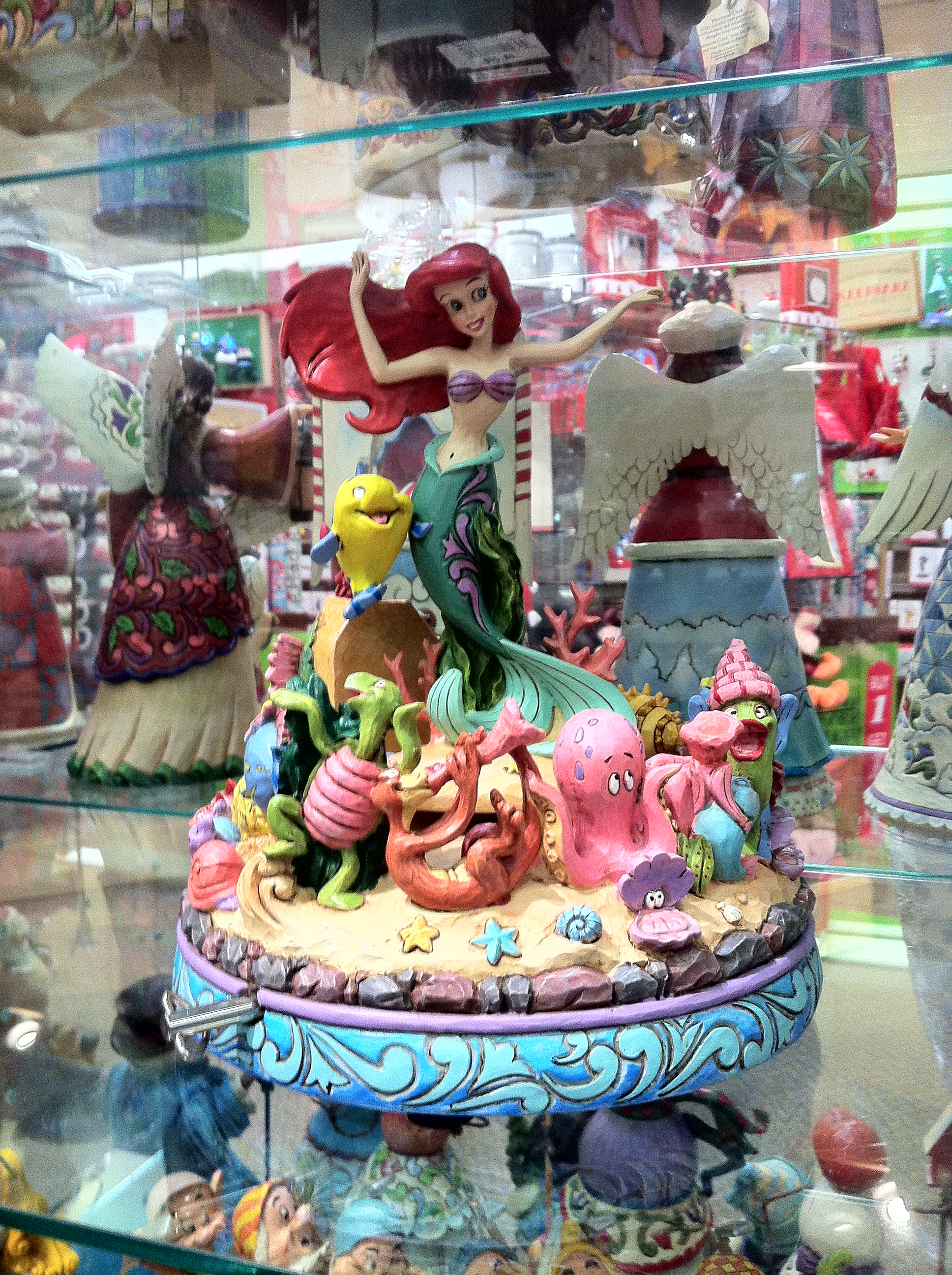 Let’s all marvel at how amazing this woodwork is. Okay, good? Good. This beautiful Little Mermaid wind up music rotating woodwork is amazing. You can find similar Disney themed items at your local Hallmark. As far as I know, no two Hallmark’s are the same when it comes to what they have in stock. I love that this is an iconic scene in the movie and that Flounder is attached to her. I LOVE FLOUNDER. The greatest thing about this is that no one looks weird of funny or off, you know? I love that she really does look like Ariel and doesn’t have derpy eyes like some toy companies try to get away with. You wind this baby up and it plays Under the Sea.