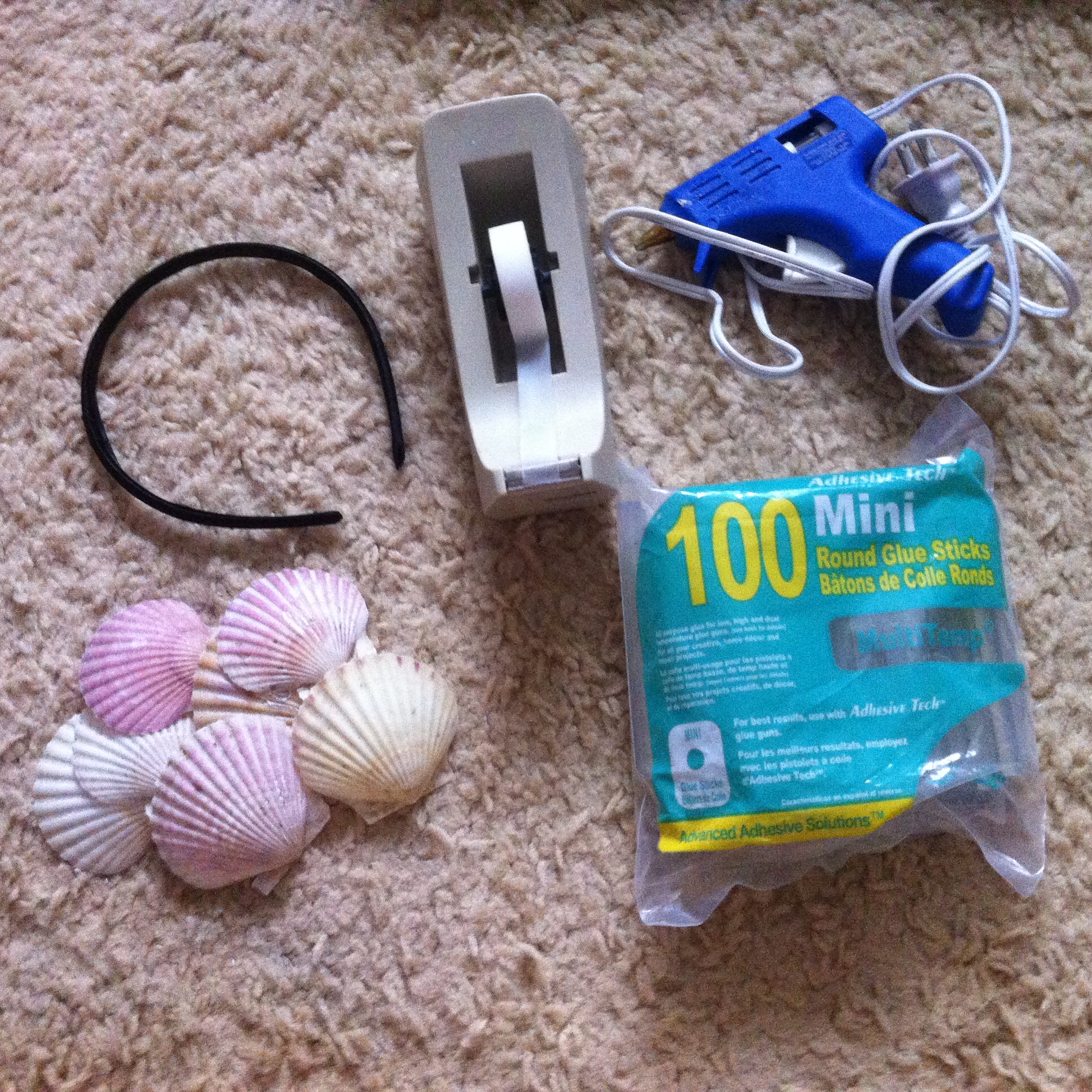 1. Put your headband on your head and hold onto where your ears are. Place tape on the the edge and then begin placing your seashells and glue the top and bottom where the seashell will touch the headband, hold firmly for at least ten seconds.