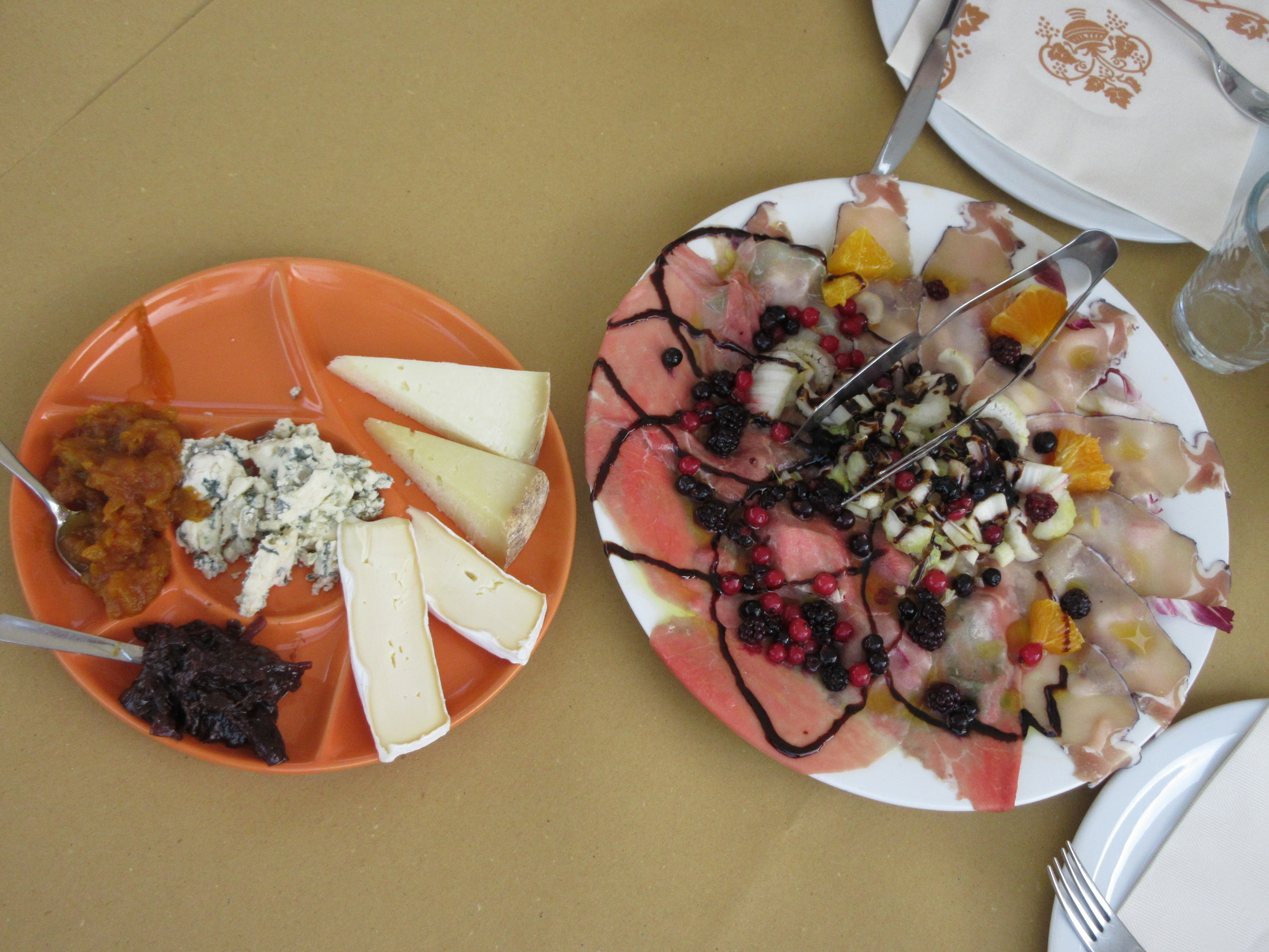 Above is two types of cheese, green tomato jam, and onion jam. The plate on the right is carpaccio.
