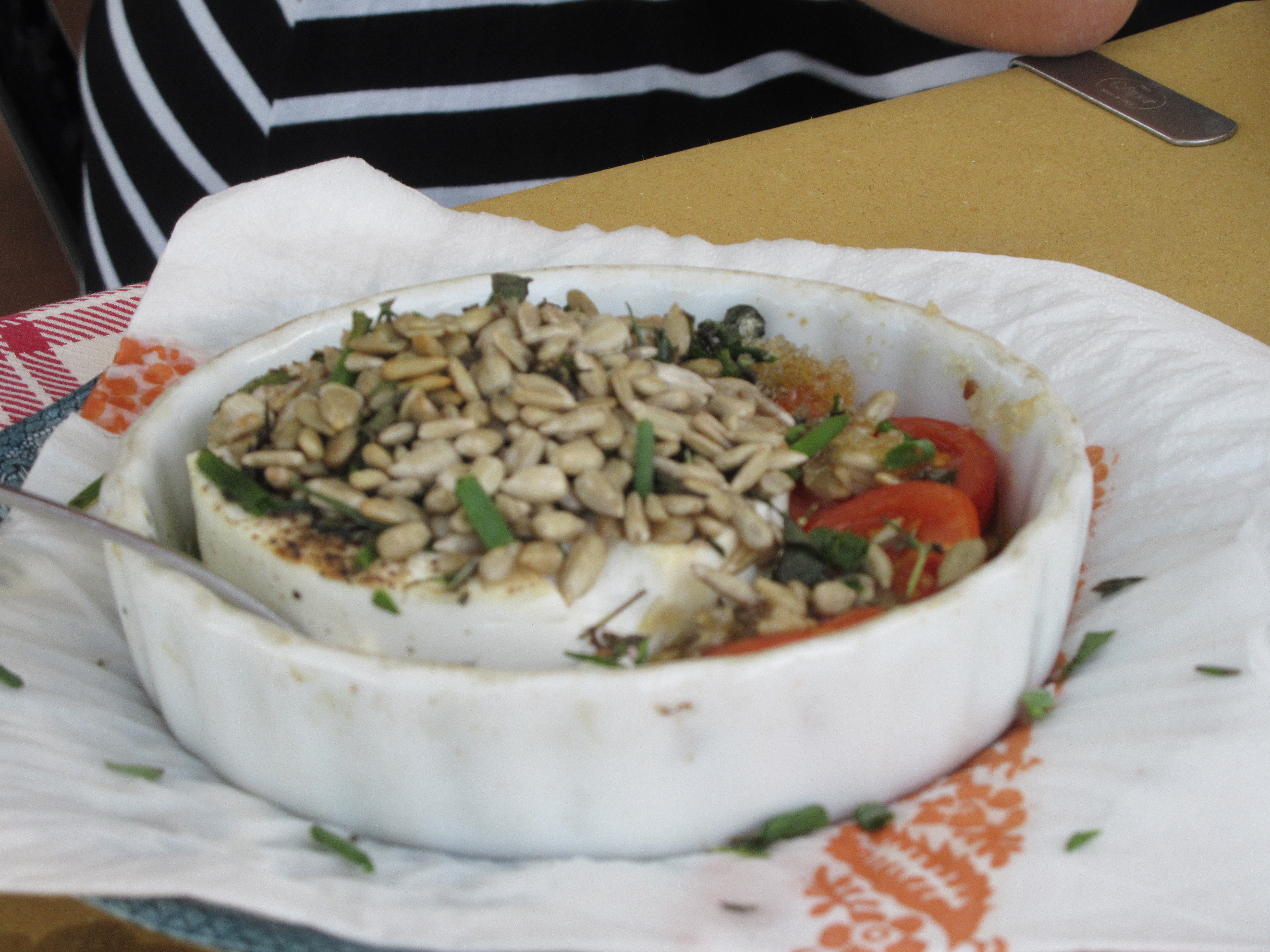 A very nice and soft, buttery cheese that melted in your mouth with what looks like lentils sitting on top.