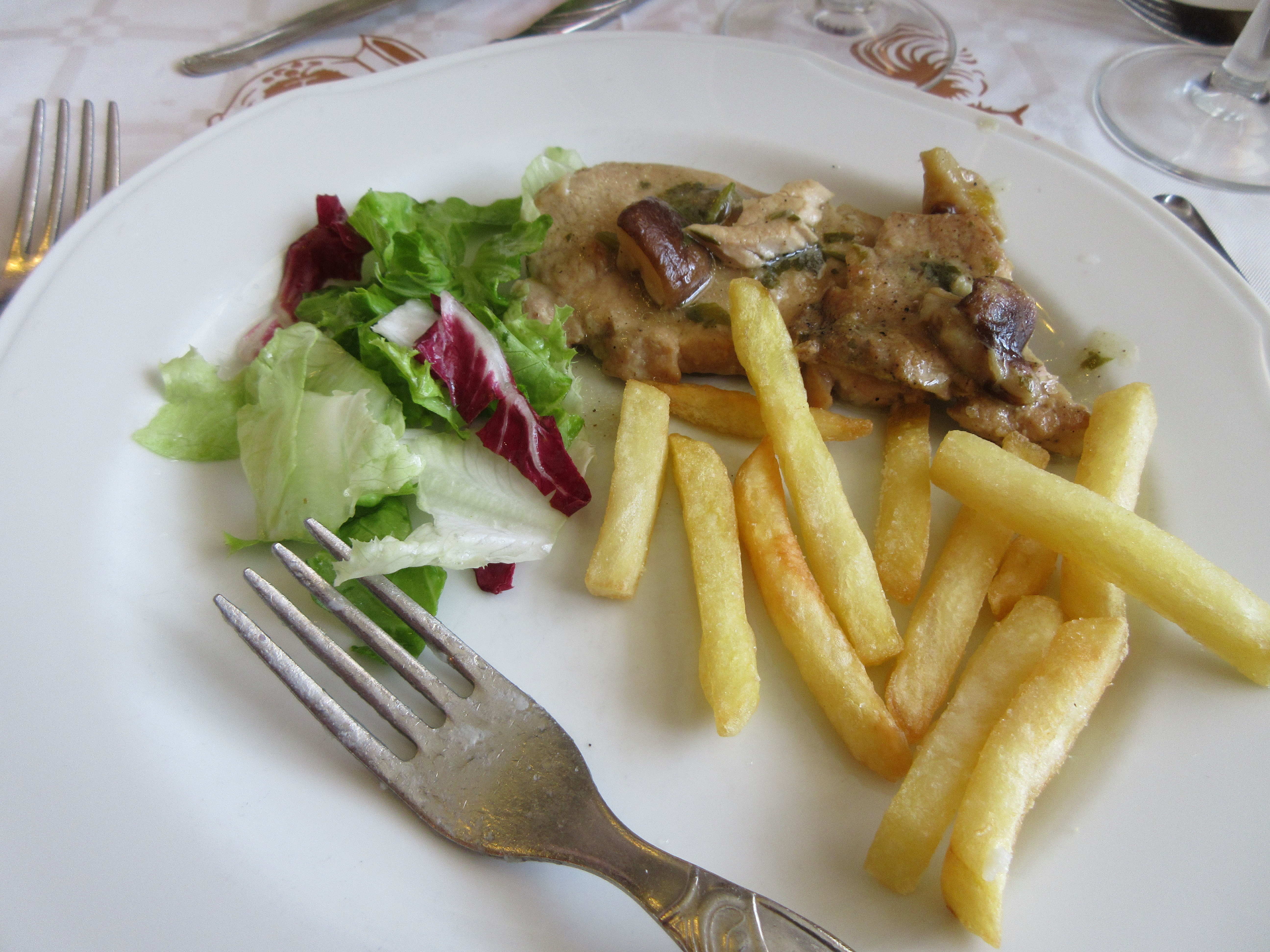 Have you ever been to a grandma’s home? In other words, a restaurant that is run by a grandmother who makes all the food herself. She has family help from her daughter and daughter-in-law who served everyone. This was a technical crew lunch paid for by the owner of the program. The first dish was lasagna but my allergy to tomatoes made that a no-go. My friend and costume designer for the program I interned for, helped me by getting a dish with no tomatoes. Just some tagliatelle with parmesan. The next bit was a mix of salad, potato fries, chicken, and eggplant.